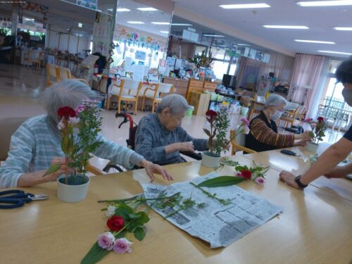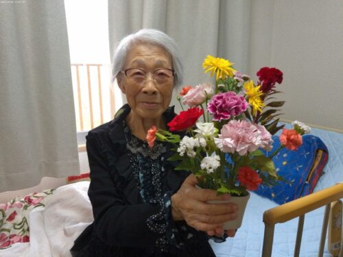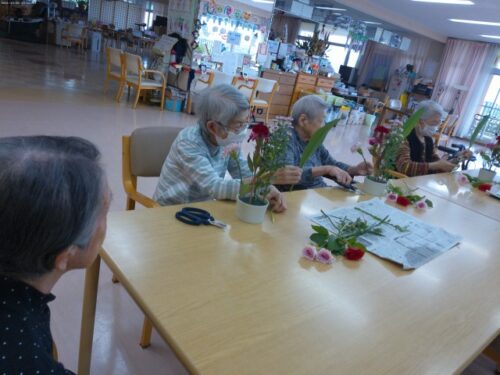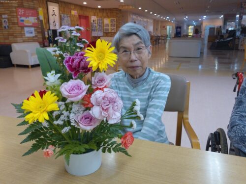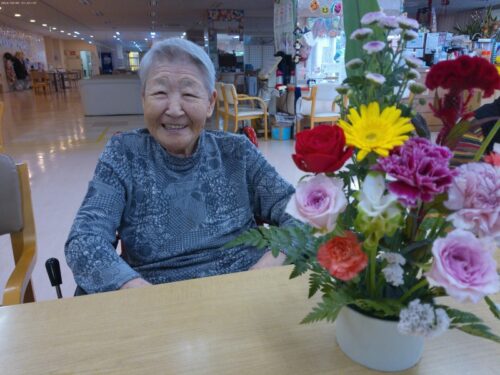 カーネーション、バラ、ケイトウ、ガーベラ等、華やかな花に囲まれて皆様も表情が生き生きと素敵な笑顔ですね!!