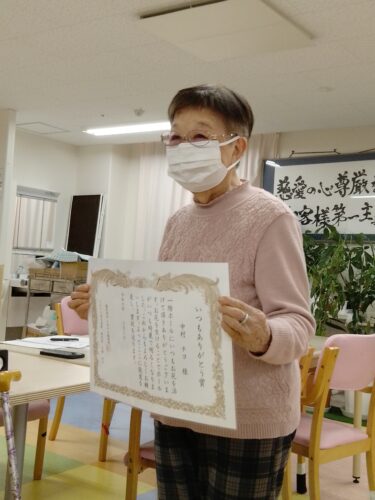 先日、職員会議の中で入居者様中村様の表彰がありました♪