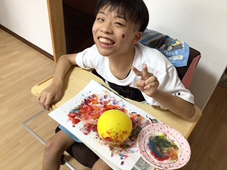 僕は、黄色い風船を使って、オレンジや青の絵具を塗ったよ~‼
