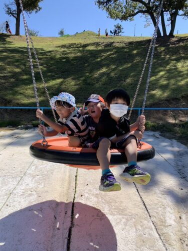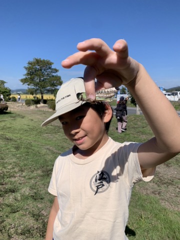 公園ではバッタもゲット!虫を触れなかった子どもも「どうやったら持てるん?」と職員に聞いてきて、触れるようになりました。バッタなら大丈夫。そのあとカマキリを見つけましたが、カマキリは噛まれますから捕まえるのはお勧めしません(私は噛まれました^^痛っ!)