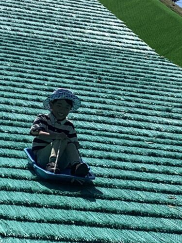 卓球は、タイガーマスクと対戦できて、子ども達は大喜びでした。芝滑りも、はじめはみんな一瞬怖がるのですが、一回勇気を出して滑ってみると、ウッヒャー!!の快感!!!何回も何回も滑っていました。スポーツ吹き矢にグランドゴルフにペタンク等々、地域の方々に教えていただいて、楽しく体験することができました。ありがとうございました!!