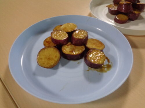 二人で作ったタレを慎重にサツマイモにかけています‼