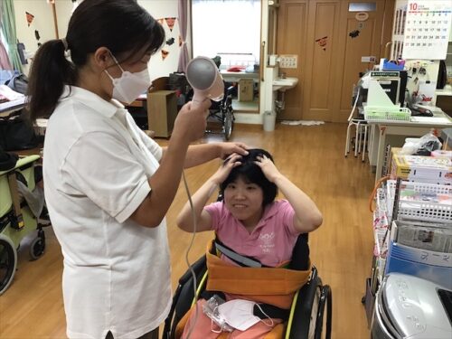 こちらのスタッフは入浴後の利用者様の髪を乾かしています!