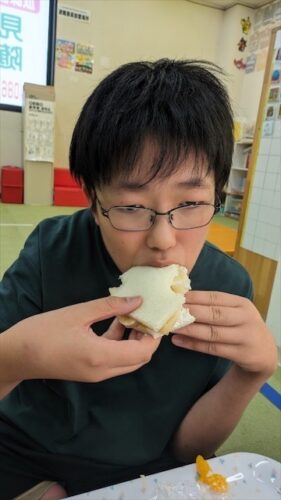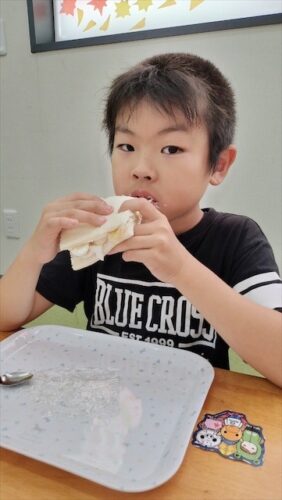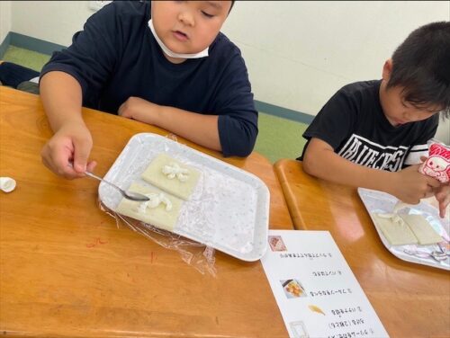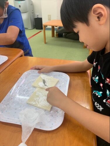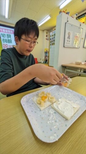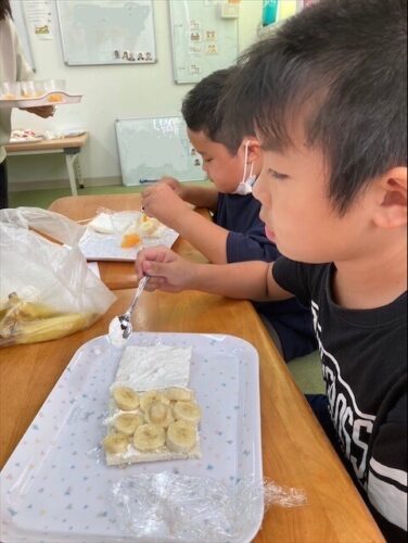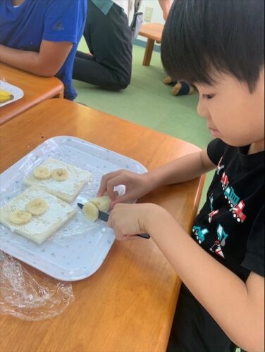 バナナの皮をむき、一口大に切ってパンの上に並べます🍌
