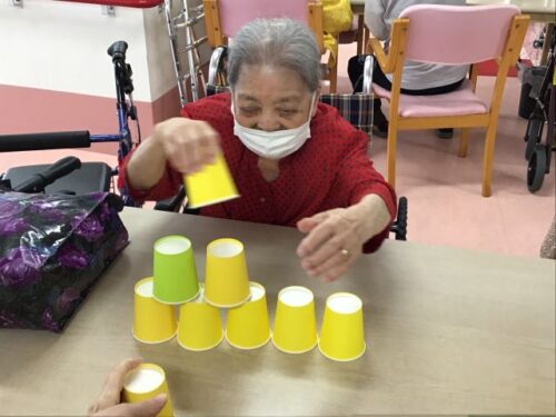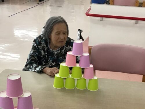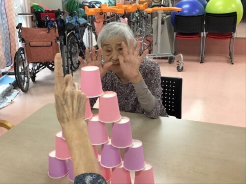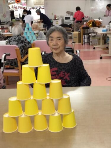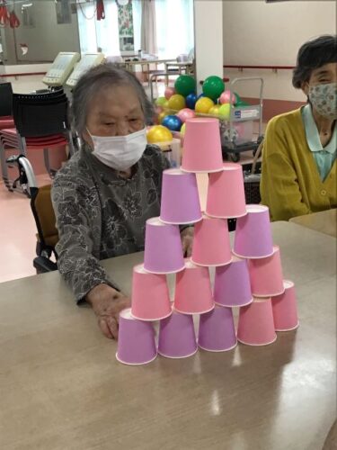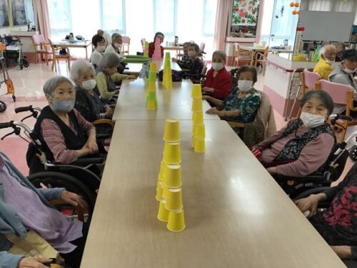 「よ~い、ドン!」で紙コップを1つにまとめて、またタワーの形に戻して頂きます😊