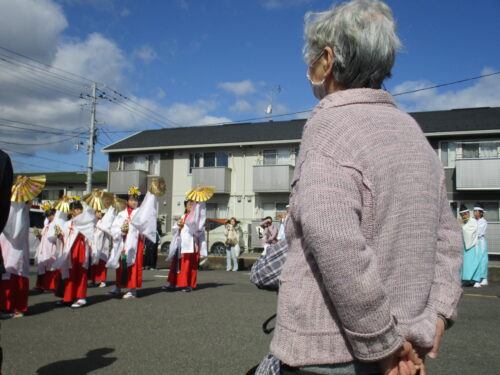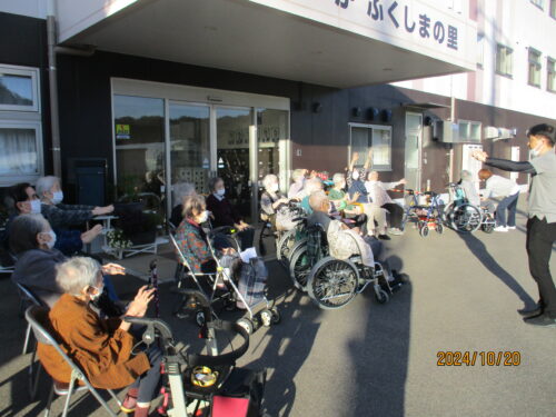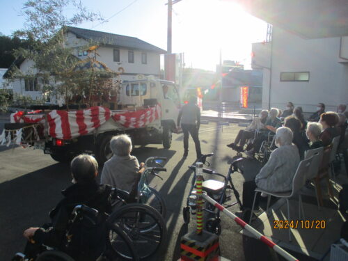 午後は、施設前玄関まで山車が来て下さりました。入居者様で山車をお迎えしました!