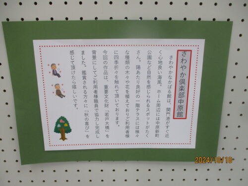 今日は前回のブログでもお知らせをした、ご利用者様が作った飾り絵が中原市民センターに飾っているとの事で、見に行きました(∩´∀`)∩