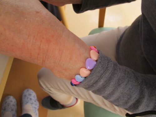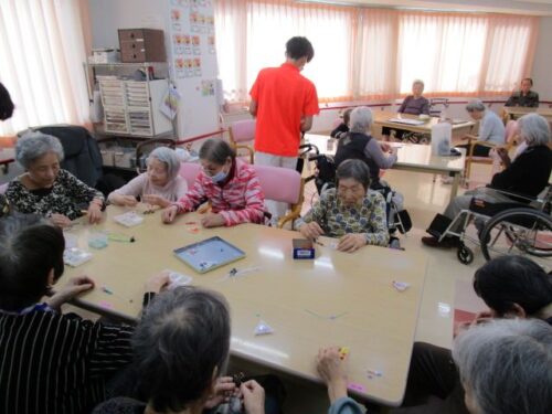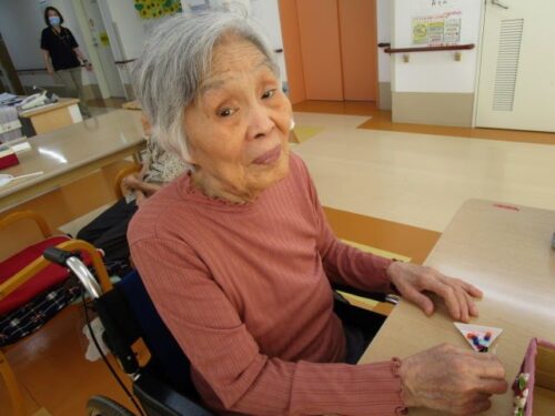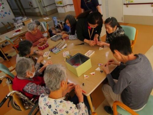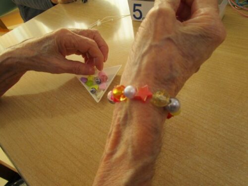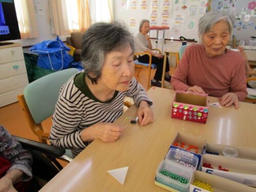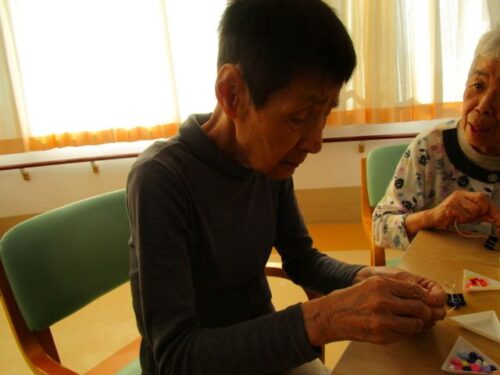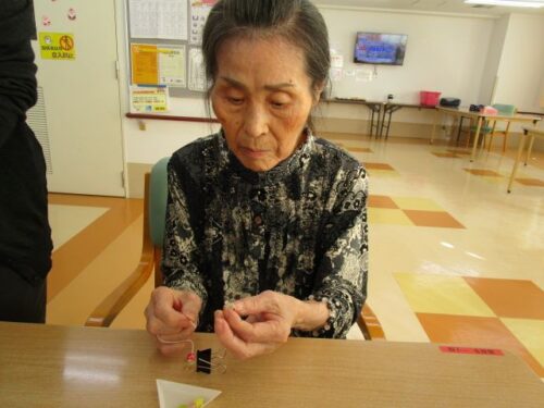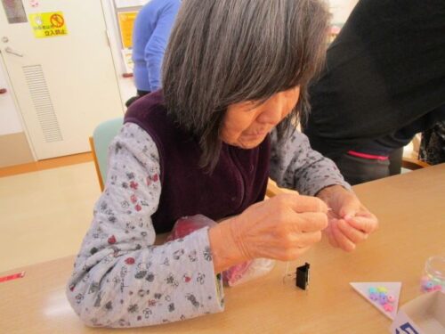 皆さん集中して一つずつ丁寧に 小さい穴に紐を通していきます