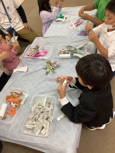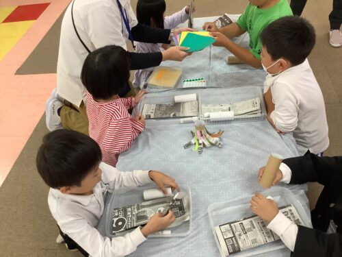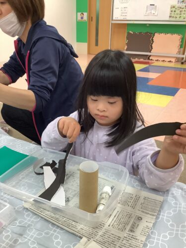 トイレットペーパーの芯に、ビリビリに破いた色紙や新聞紙を貼って作っていきます👍