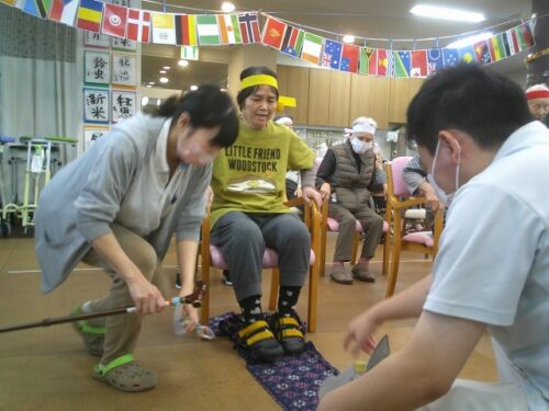 頑張って足でタオルを引き寄せて足元まで来た獲物をキャッチし、