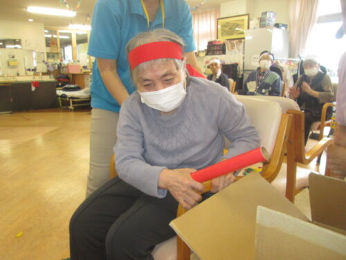 イスに風船を置き座って割ります😊