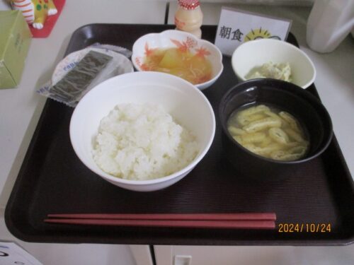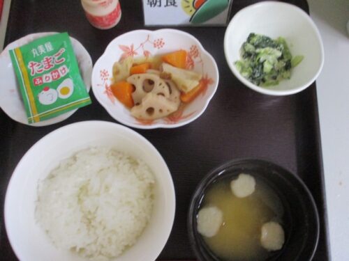ご飯・ちくわと根菜の煮物・小松菜胡麻和え