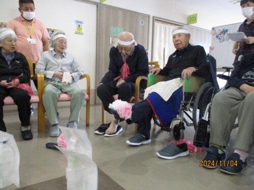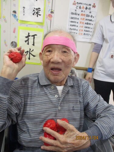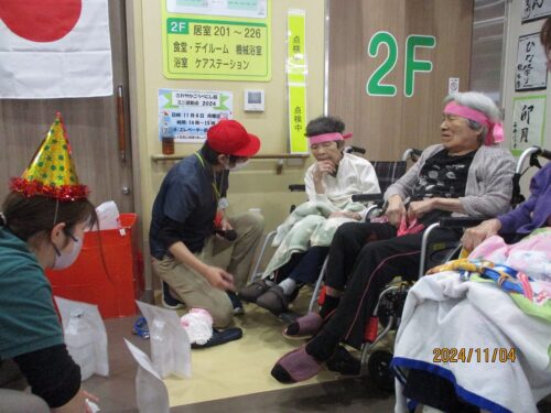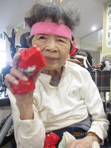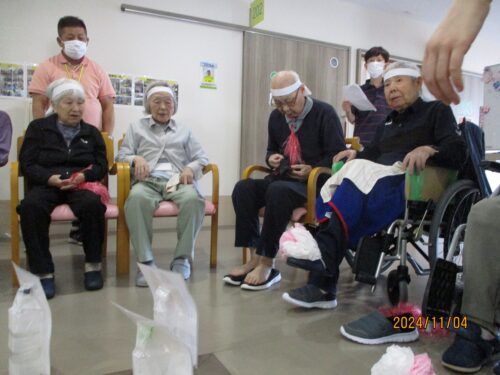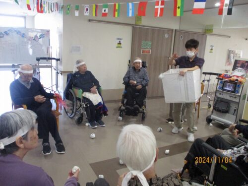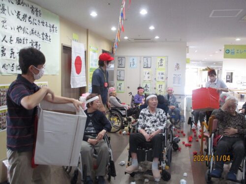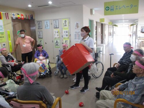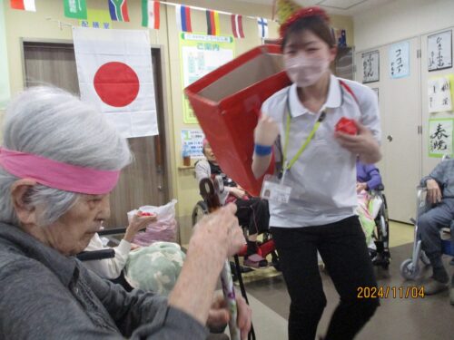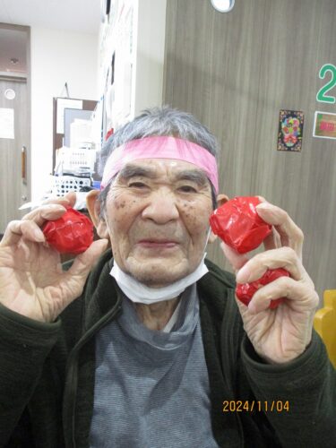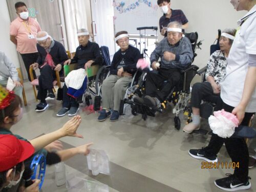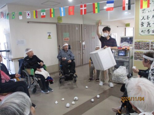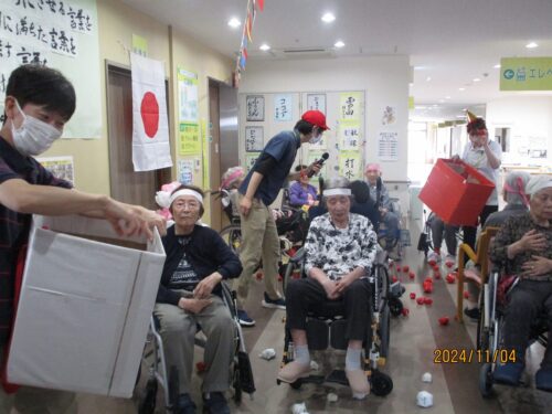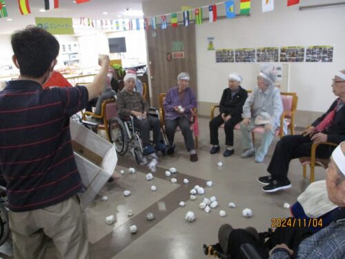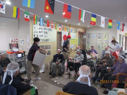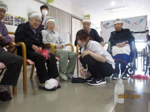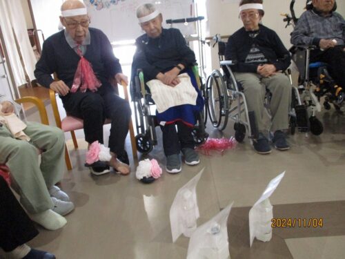 スリッパ飛ばしと玉入れの2種目を行い競い合いました。