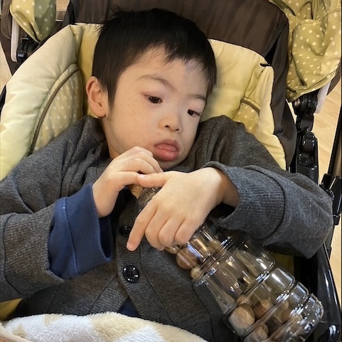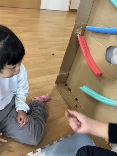 職員からどんぐりを受け取ると手を伸ばして上手に転がして遊べました👍