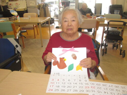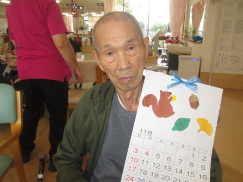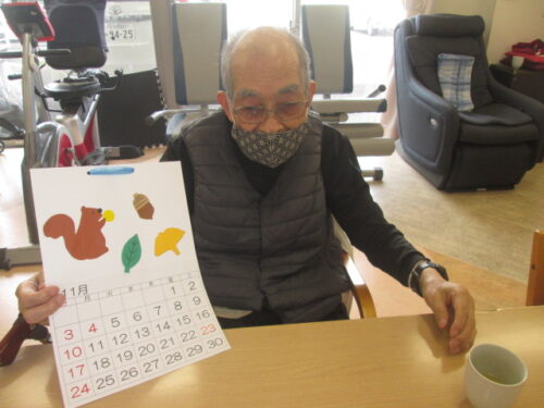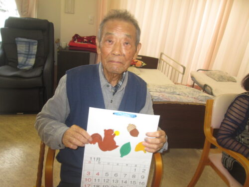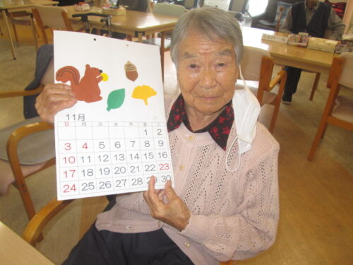 さわやか行橋弐番館 11月カレンダー製作③ 2024-11-06 2024-11-06 完成したカレンダーで記念撮影です📷 とても素敵な表情です✨ デイサービスでは月に1度カレンダー製作を行っています😊