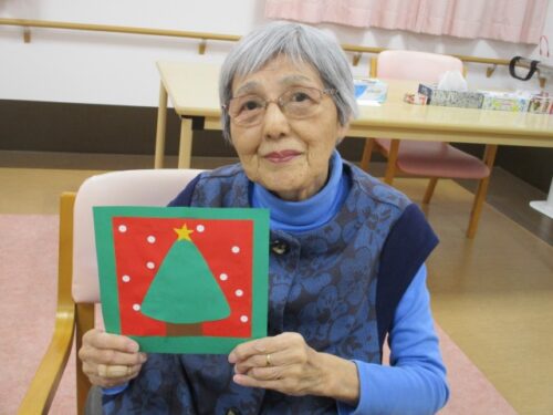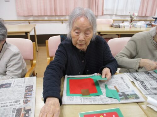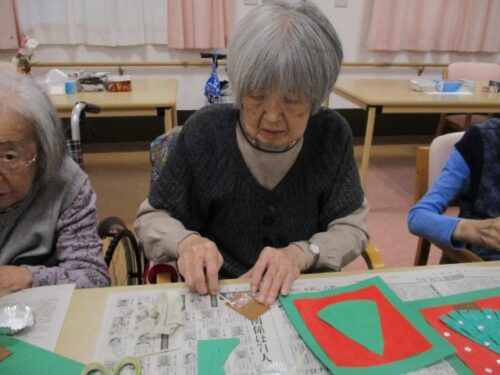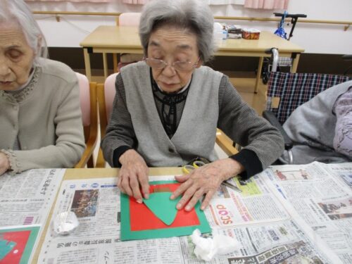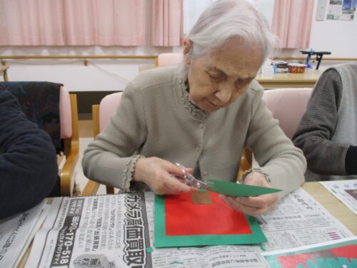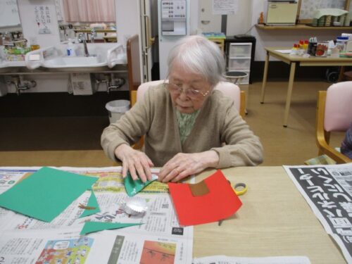 赤や緑の色画用紙を切り貼りして、白いシールを貼っていきます🎶