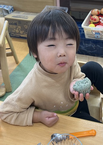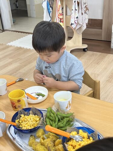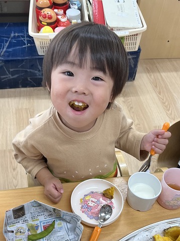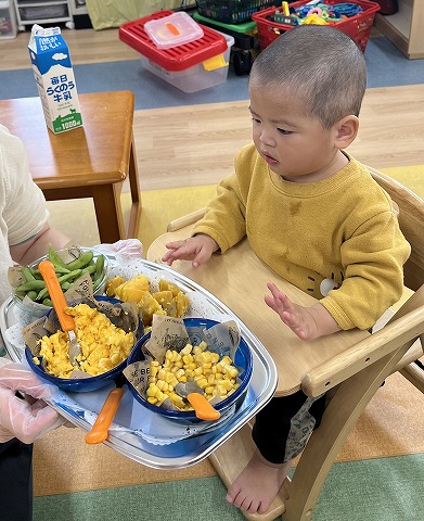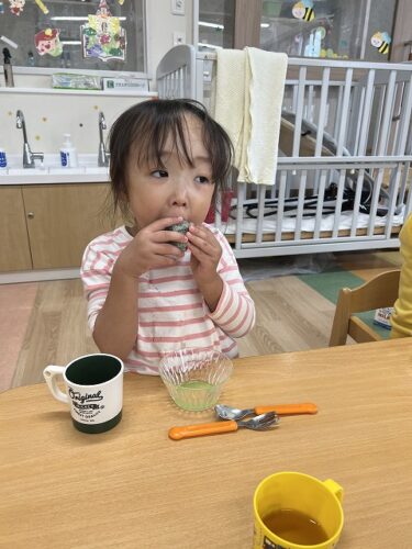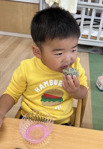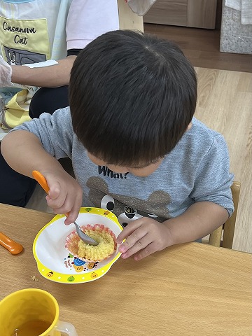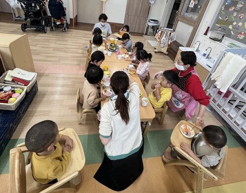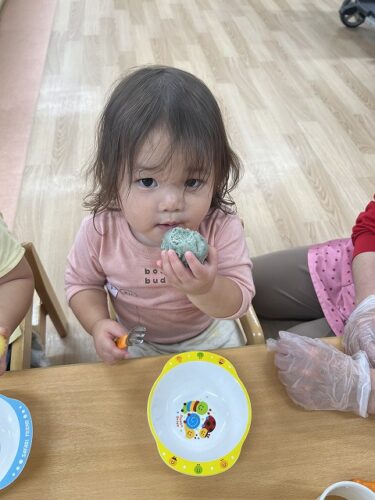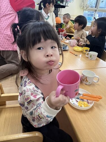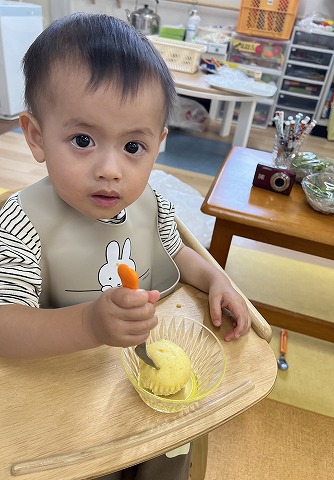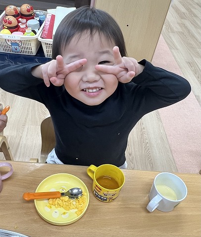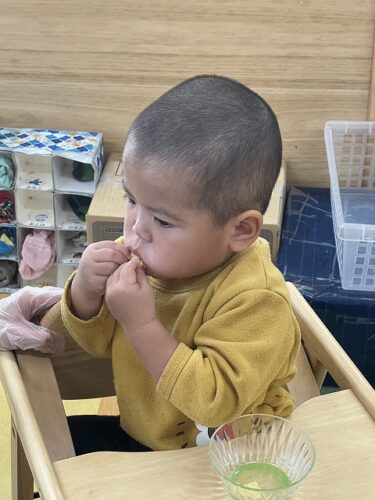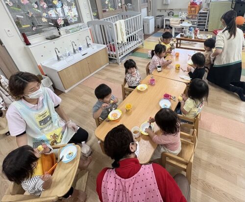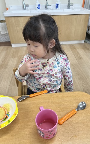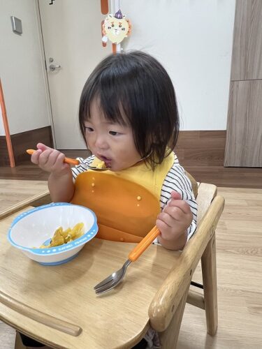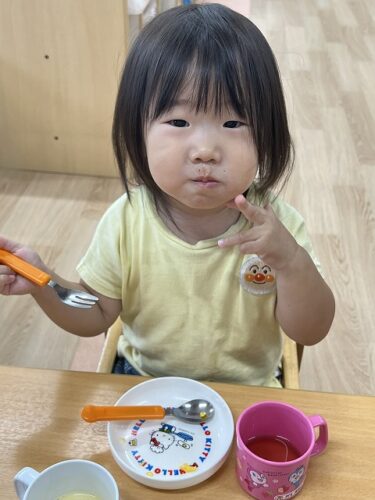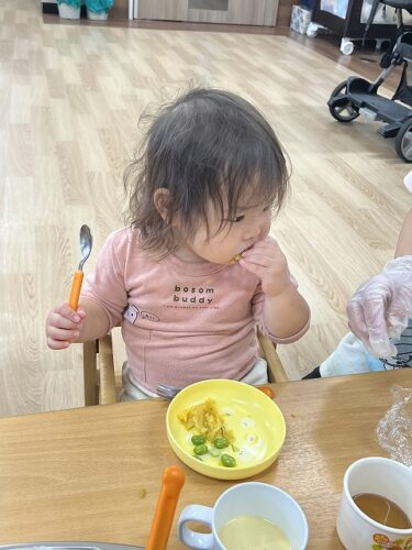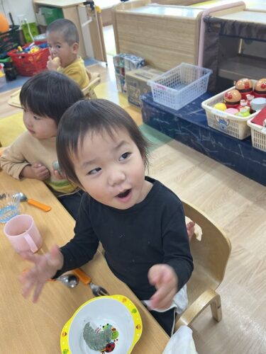 「おかわりお願いします!」(先生とゆっくり食べようね)