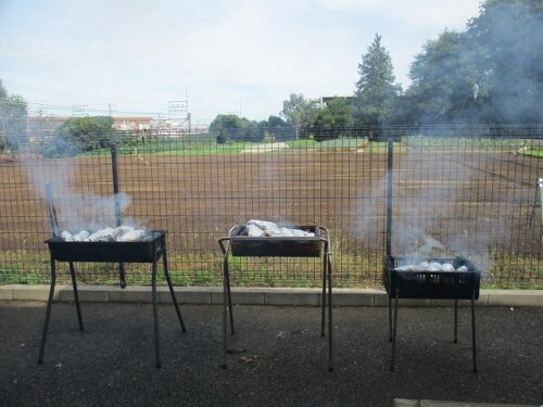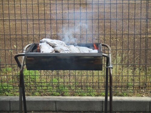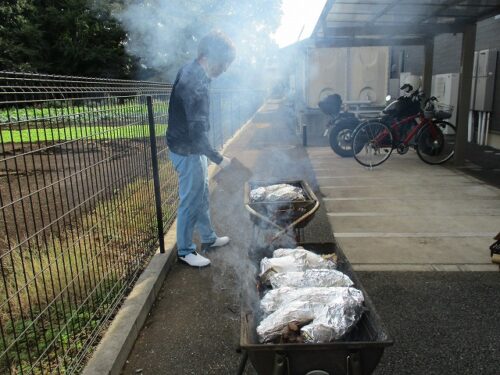 朝からさわやかあびこ館のお庭では煙がもくもく
