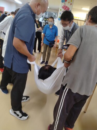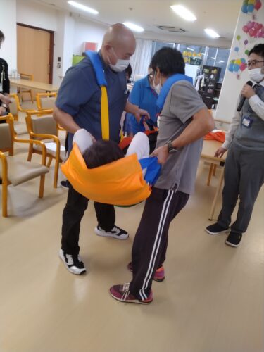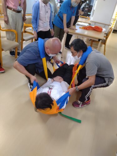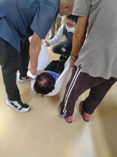 いざ担架を使って運ぶ練習、肩紐の掛け方など