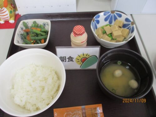 ご飯・高野豆腐含め煮・インゲンのゆかり和え