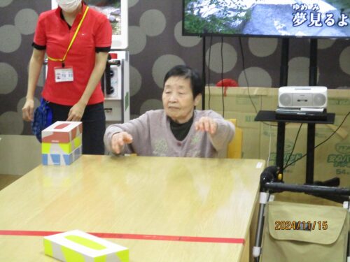 ティッシュ箱を滑らす姿に応援しているお友達は・・・(笑)