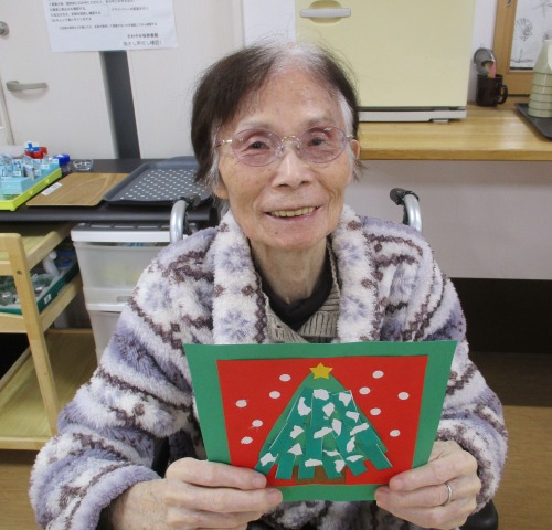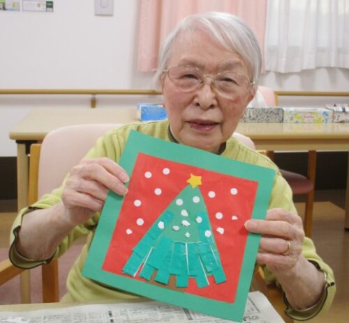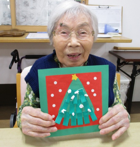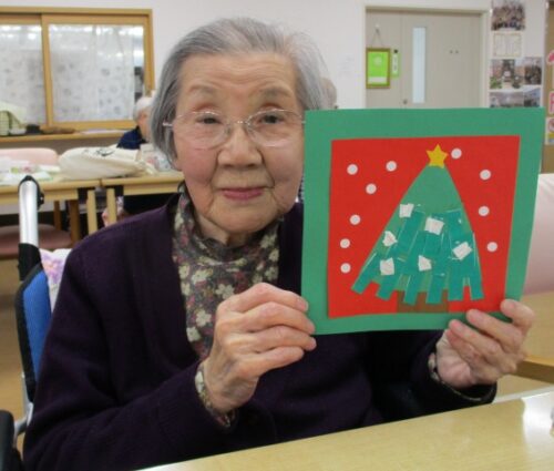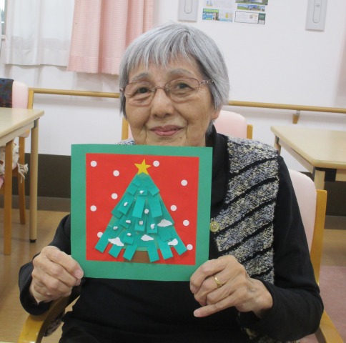 緑の台紙に赤と緑の色紙で、もみの木を貼りつけてくださっていますね!