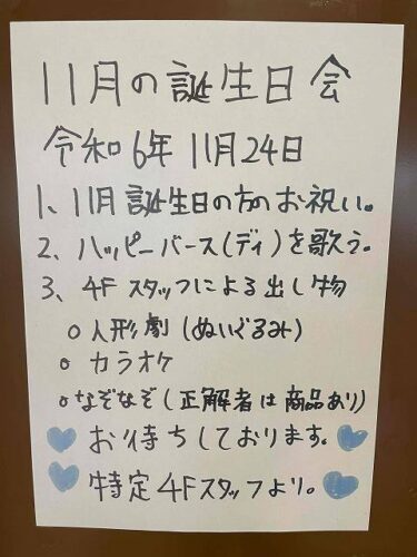 11月誕生会が開催されますから、みなさまのご参加お待ちしておりますよ🤗🎁✨