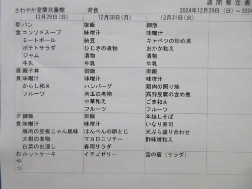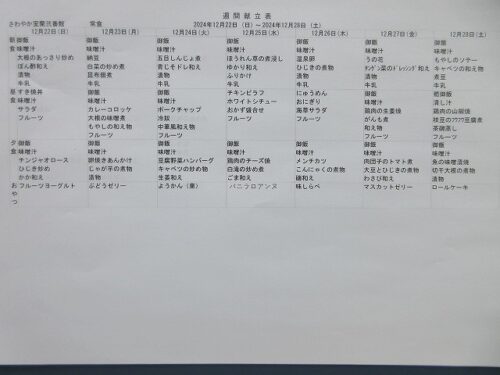 さわやか室蘭弐番館 12月 献立♪ 2024-12-01 2024-11-30 皆様こんにちは♪ 今月の献立をお届けします 行事食は25日(水)昼食 28日(土)昼食 31日(火)夕食です 食材の都合により急遽変更させて 頂く場合もございます ご了承ください