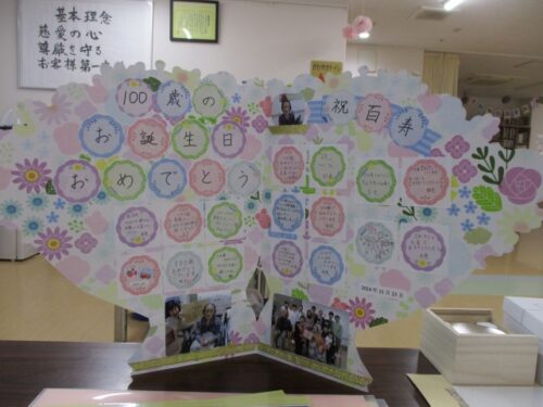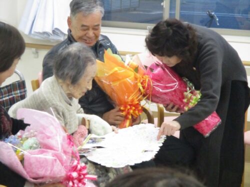 ひ孫さんからお花やメッセージの書かれた色紙を受け取っており、