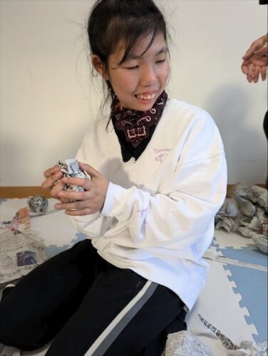 新聞紙をぐちゃぐちゃと丸めてボールを作るところから頑張りました♪