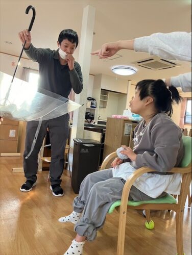 低学年の児童も座位の児童も少し下がった傘目掛けて投げ込む事ができました。