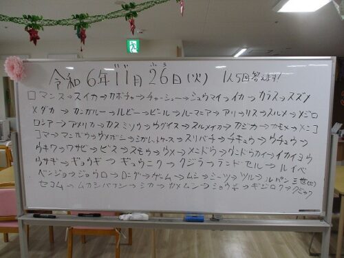 さわやか室蘭弐番館 3階 26日活力朝礼♪ 2024-11-27 2024-11-27 皆様こんにちは♪ 昨日の様子をお届けします 9時からラジオ体操です 最後は大きく深呼吸です 頭の体操はしりとりです ホワイトボードを埋め尽くしました 楽しい一日になります様に☆