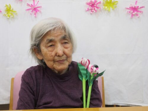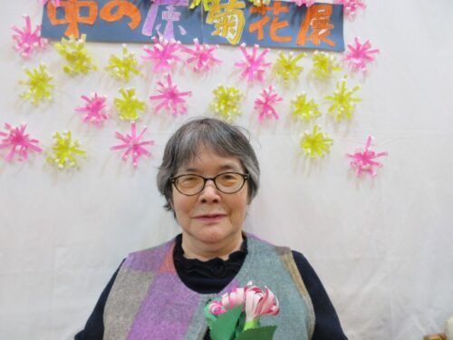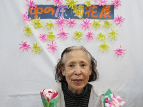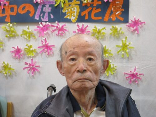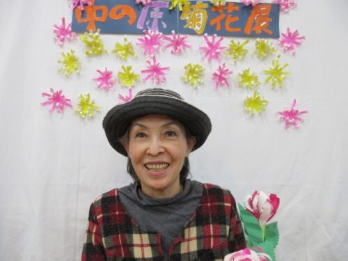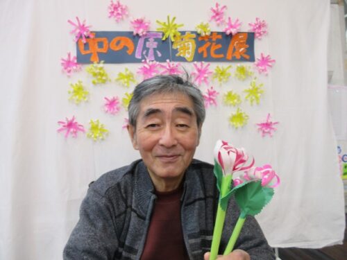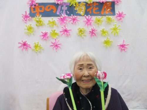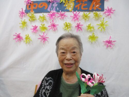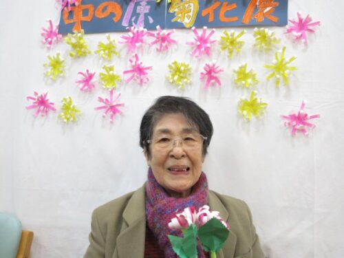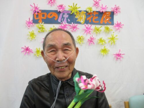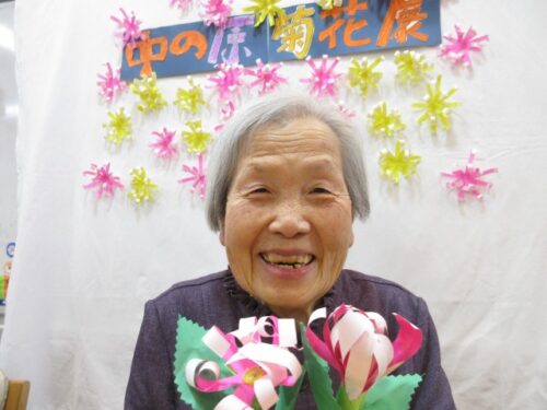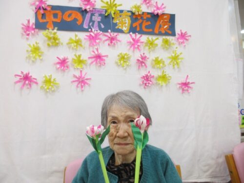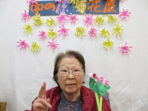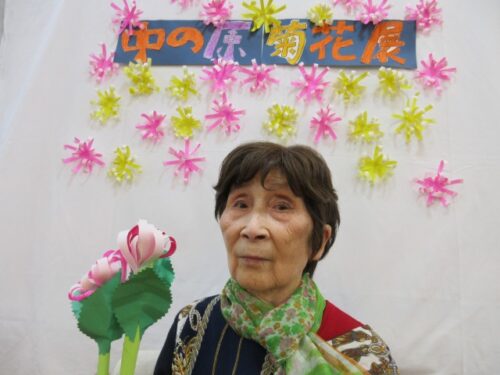 職員とご利用者様の共同で折り紙で菊を作り、それを背景に皆で記念撮影をしました。