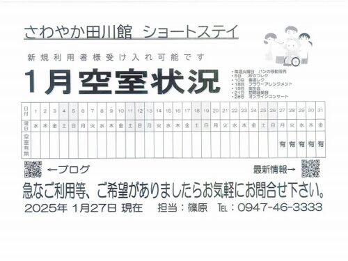 ショートステイの空室状況 1月/2月 [さわやか田川館]