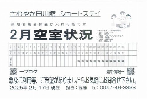 ショートステイの空室状況 2月/3月 [さわやか田川館]