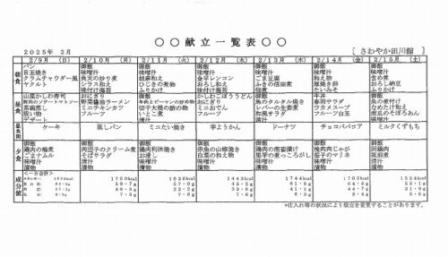 献立のお知らせ 2/9~2/22 [さわやか田川館] 😋