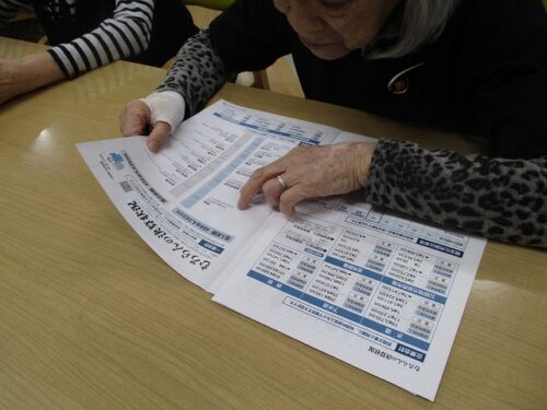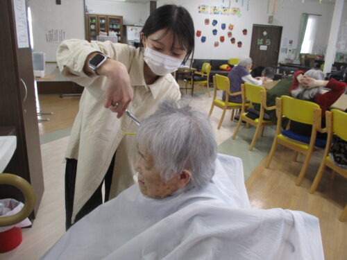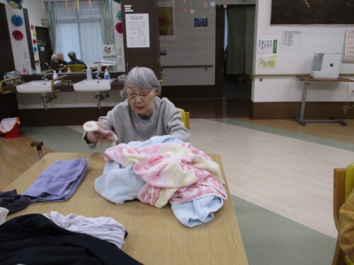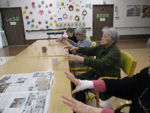 入居者様と職員で挨拶・ハイ(返事)の練習から始まり、ラジオ体操、カラオケ、学習(漢字・計算問題など)、運動(ボール回し・サッカーゲームなどの手足を使った運動)の2つを織り交ぜたレクリエーションをメインに365日施設全体で元気を発信しています。