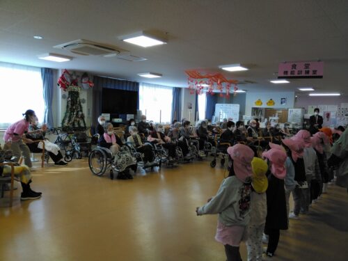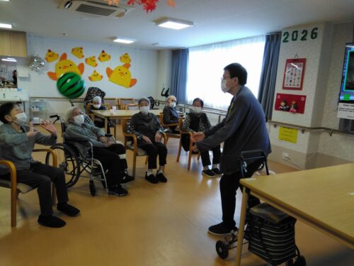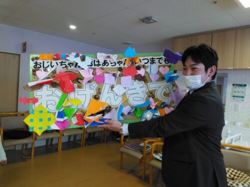 毎朝9時から約30分ほどかけて入居者様に元気にそして前向きに一日を生活していただくために活力朝礼という取り組みを行っております。朝から『明るく元気よく』をテーマにラジオ体操から始まり声出しをします。身体が温まったら次に簡単な計算問題はじめ漢字クイズなど認知症の予防や脳を活性化させるような取り組みを実施し、その後は入居者様お待ちかねの職員が工夫を凝らしたレクリエーション♪