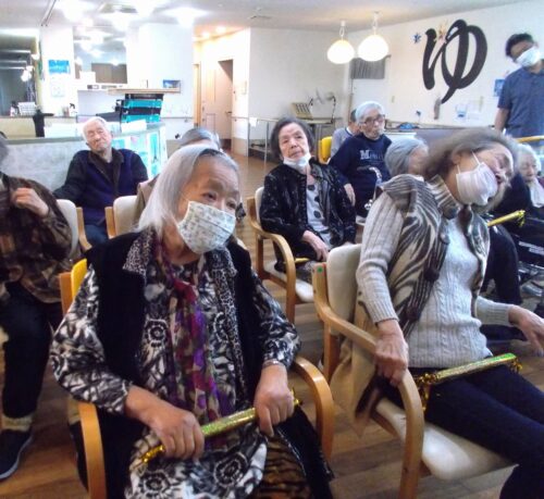 毎朝、50名以上の入居者様が「活力朝礼」に参加され、職員と一緒に日替わりのレクレーションを楽しんでいらっしゃいます。また季節の歌(月替わり)を、全員で大きな声を出して合唱しています。おかげで入居者の皆様、職員ともに、毎日を健やかに明るく過ごすことが出来ます。