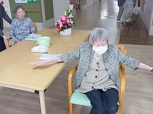 入居者様と職員で挨拶・ハイ(返事)の練習から始まり、ラジオ体操、カラオケ、学習(漢字・計算問題など)、運動(ボール回し・サッカーゲームなどの手足を使った運動)の2つを織り交ぜたレクリエーションをメインに365日施設全体で元気を発信しています。