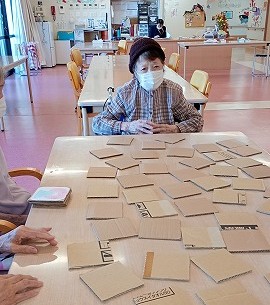 身体が温まったら次に簡単な計算問題はじめ漢字クイズなど認知症の予防や脳を活性化させるような取り組みを実施し、その後は入居者様お待ちかねの職員が工夫を凝らしたレクリエーション♪毎日可能な限りご参加をいただくことで生活の中にリズムが生まれ一日を快適に過ごしていただけるようにしていきます。