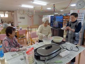 さわやか新居浜館では、様々な調理レクを入居者さまと一緒に計画しています。もちろん調理レクで必要な材料も一緒に買いに行きます。手巻き寿司や広島風お好み焼き桜餅などのご当地料理や季節の食べ物までなんでも手作りします。