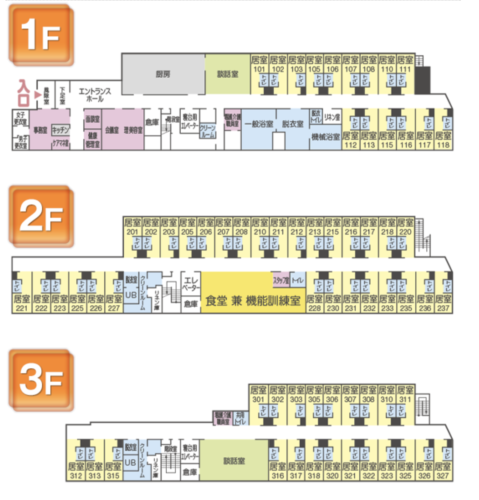 建物は鉄骨造の3階建て、館内は全室個室となっており、トイレ・洗面台・ベット・エアコンに加え、アンシエル(見守りセンサー)も備え付けで充実しています。居住スペースが広く落ち着いた雰囲気に設計し、より楽しく元気に生活してもらえる環境が整っています。施設は閑静な住宅街の中にあり自然豊かな場所で、近くにはスーパー、ホームセンター、コンビニ、飲食店も充実しております。